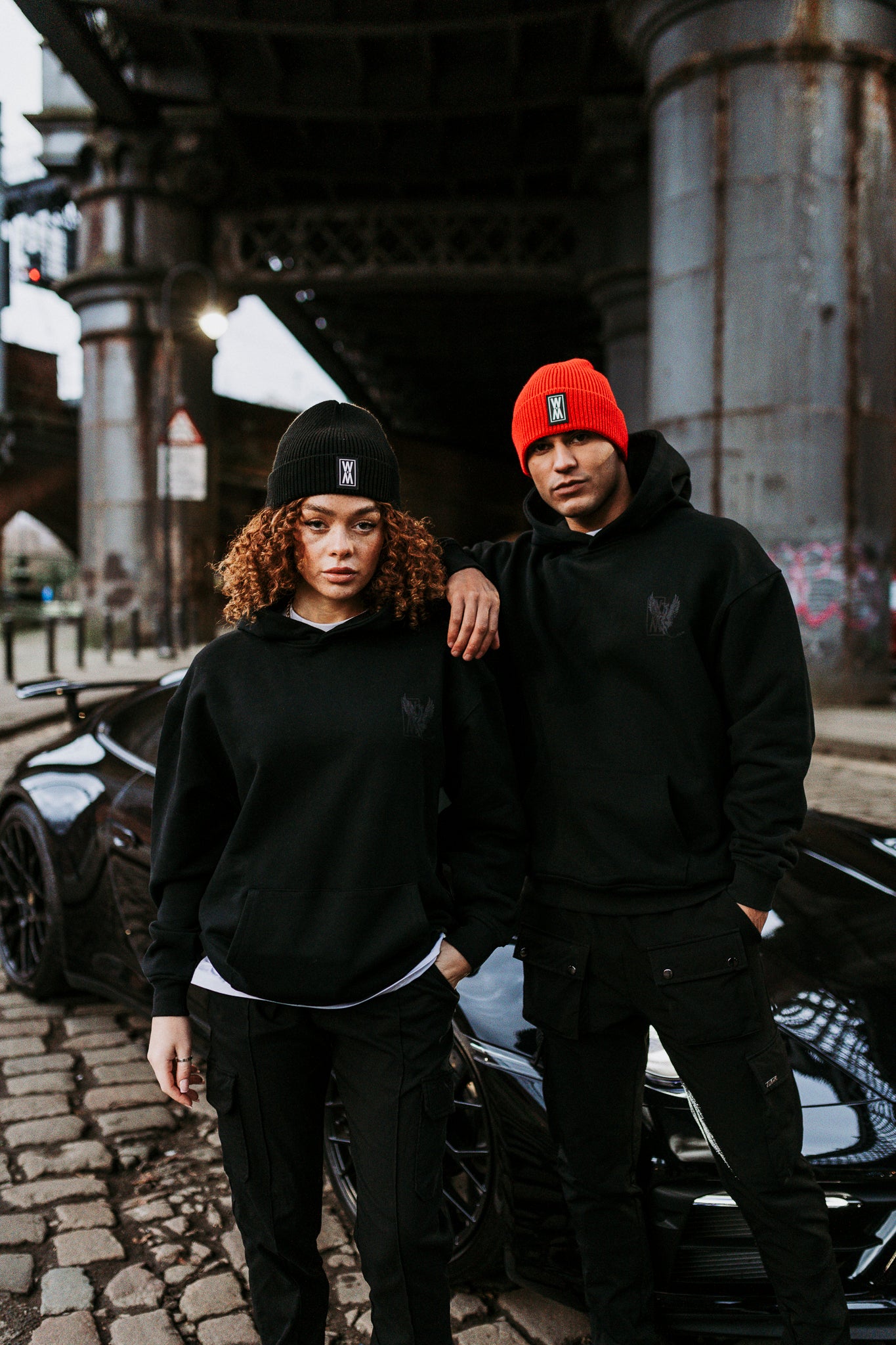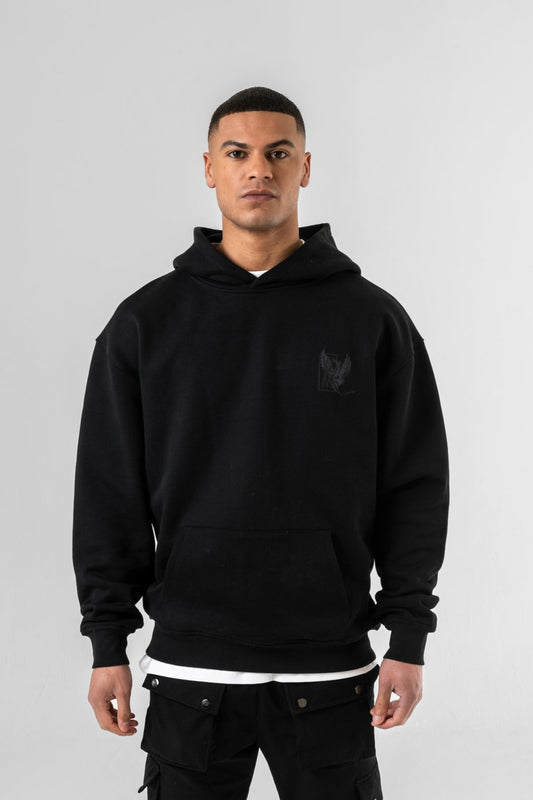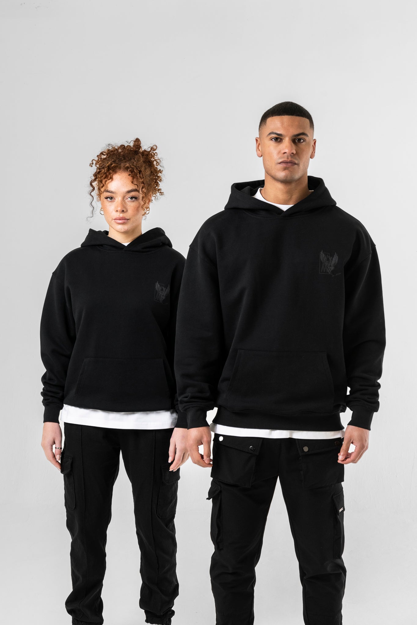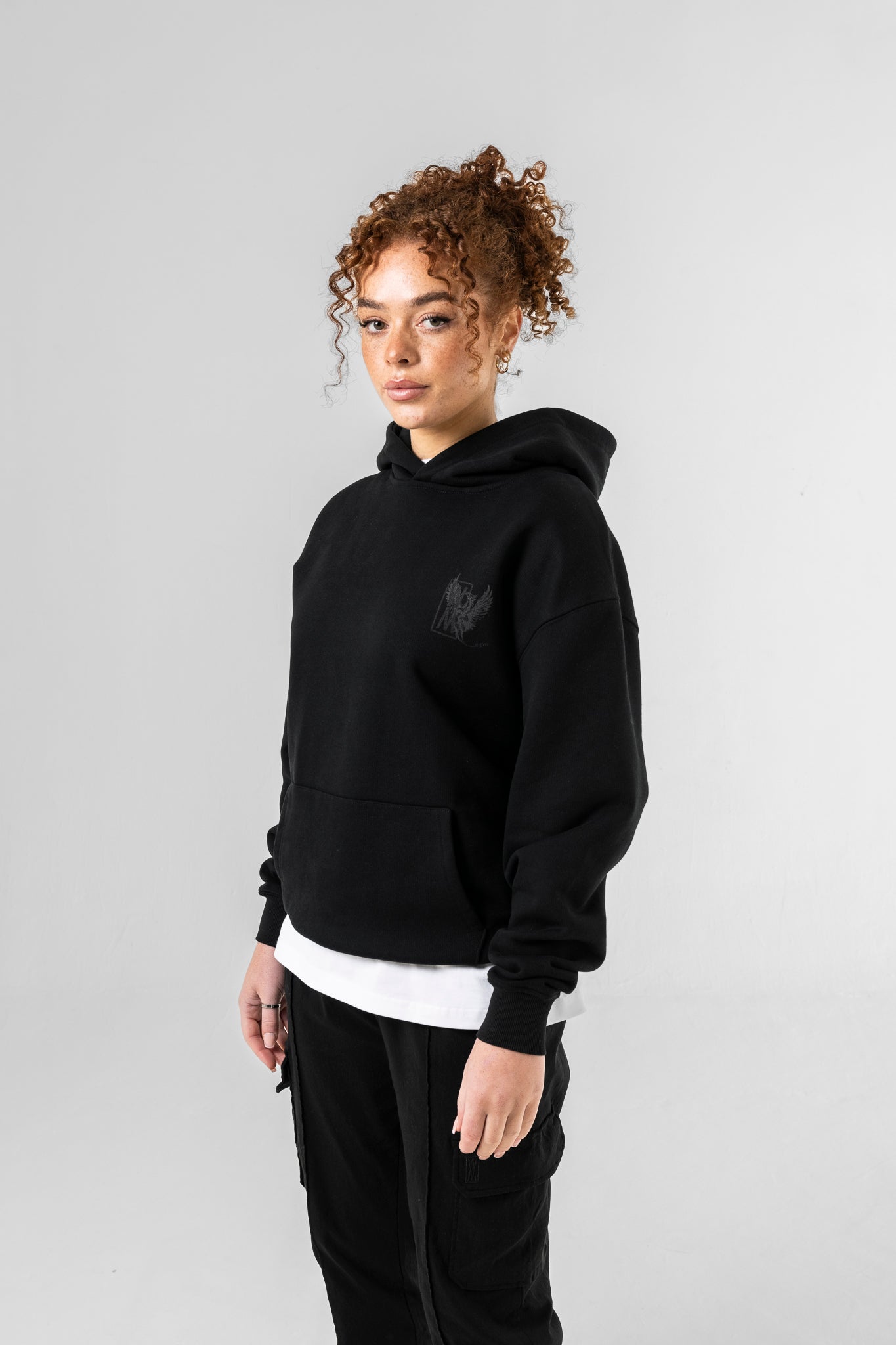 Our Black heavyweight 590 gsm cotton loopback with an oversized fit. Delicate but tough for the conclusive complete hoodie. Ribbed hem and cuffs. Our WXM and Draig brand print to the left breast.