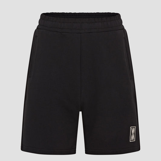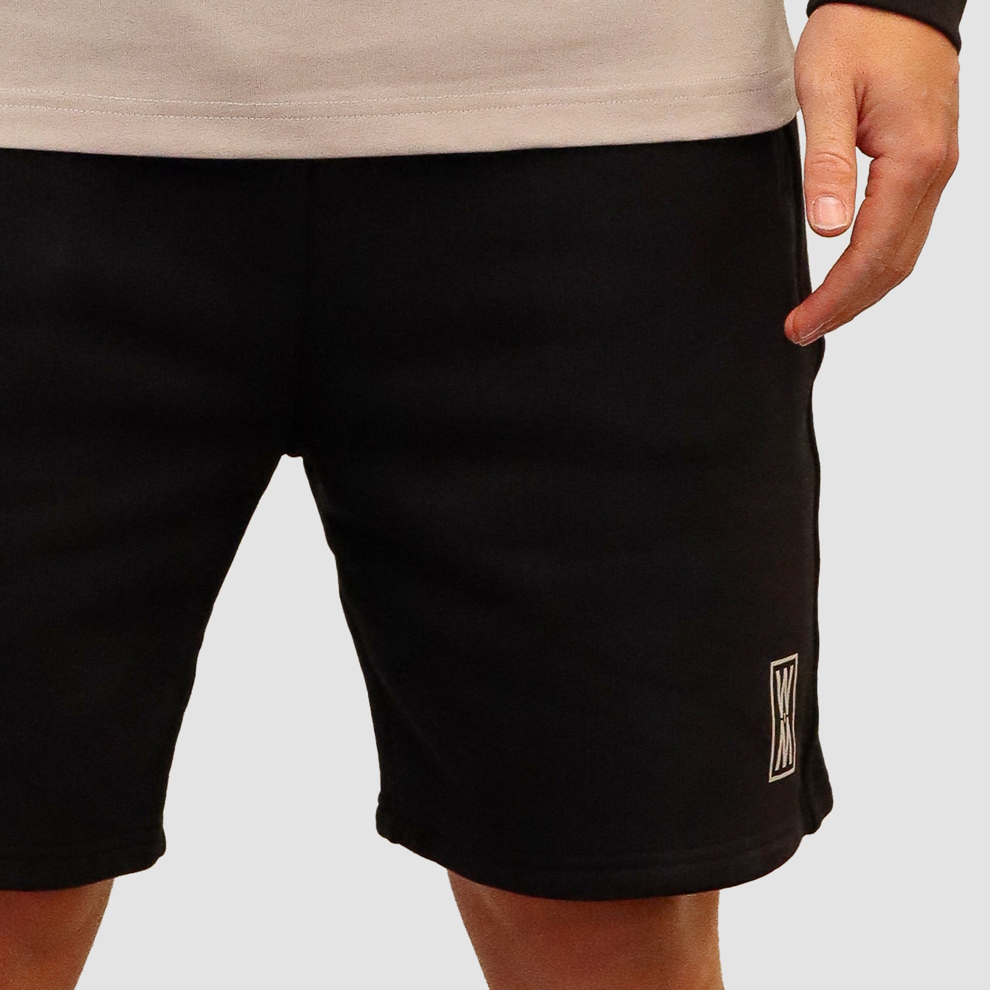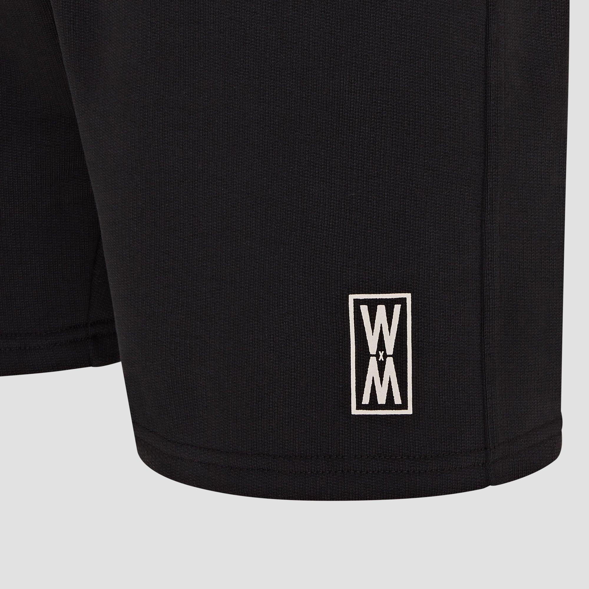 Our Black heavyweight 590 gsm cotton loopback shorts with Oslo grey print, drawstrings and WXM string ends. Finished with with our Oslo grey WXM brand print to the left leg.