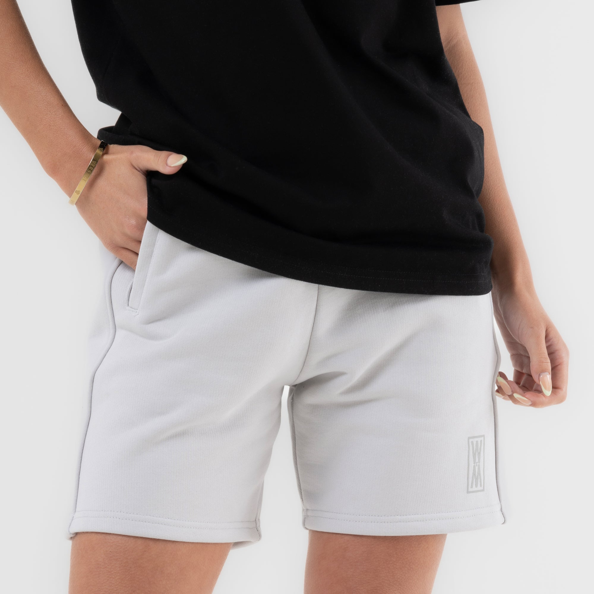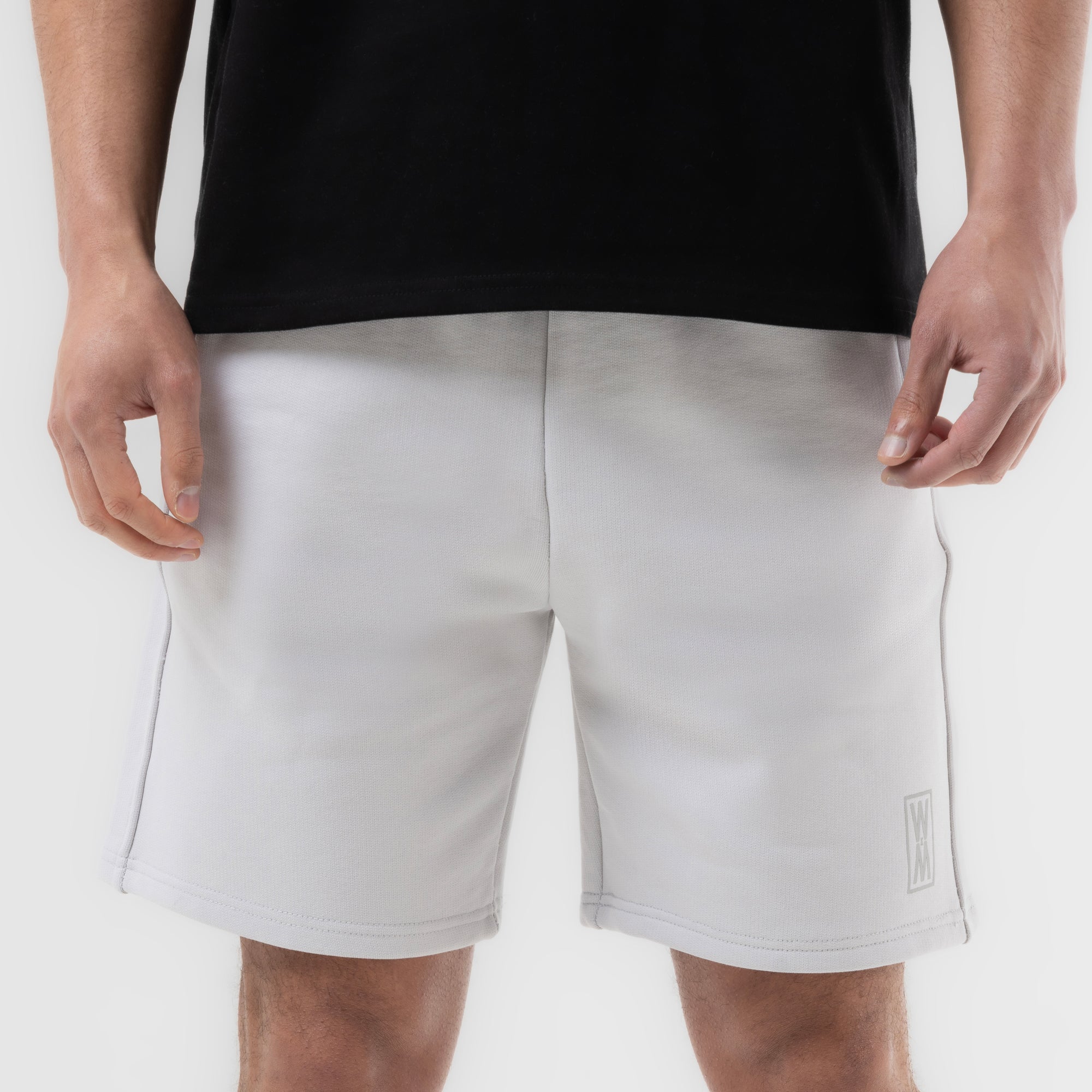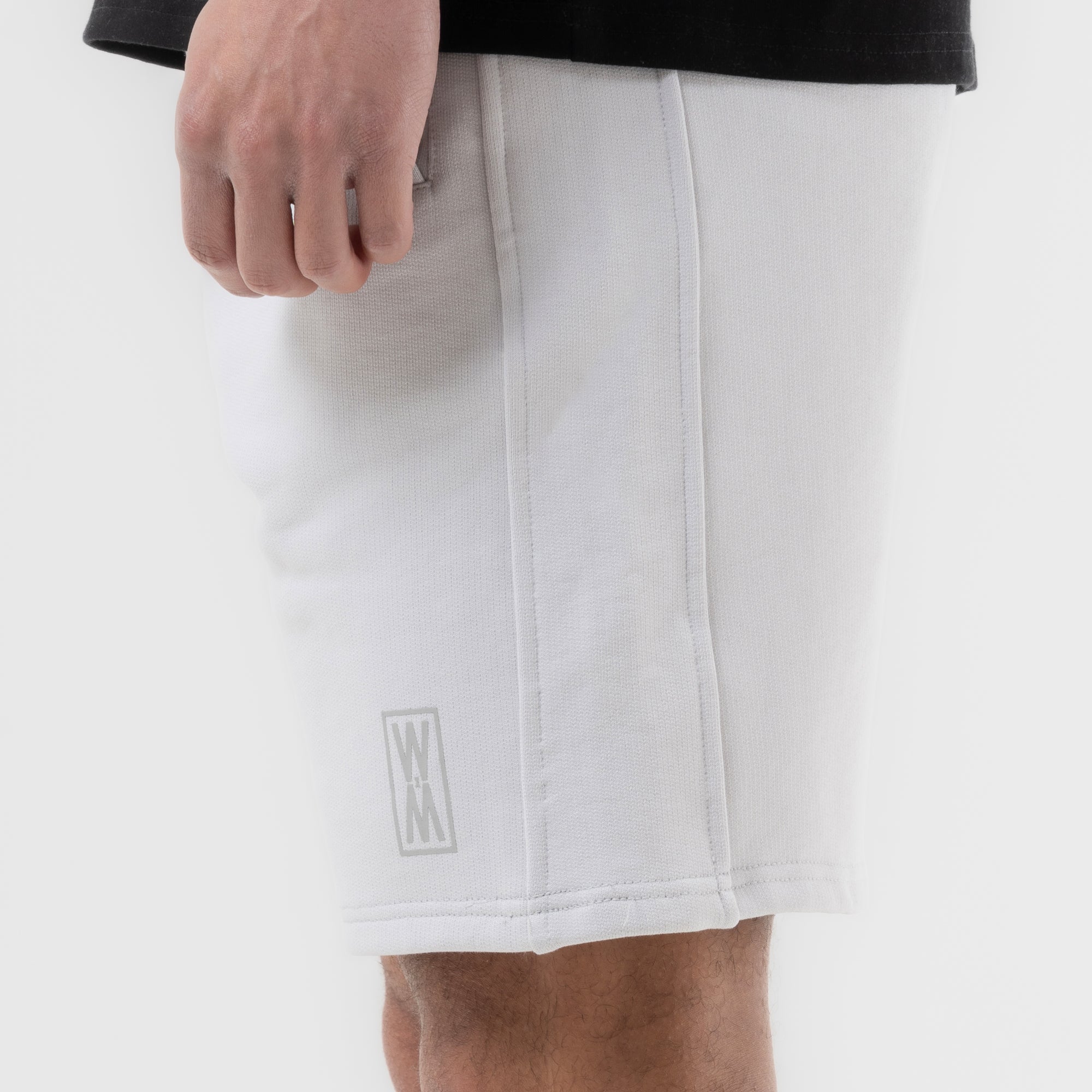Our Oslo Stone heavyweight 590 gsm cotton loopback shorts with tonal grey print, drawstrings and WXM string ends. Finished with with our tonal grey WXM brand print to the left leg.