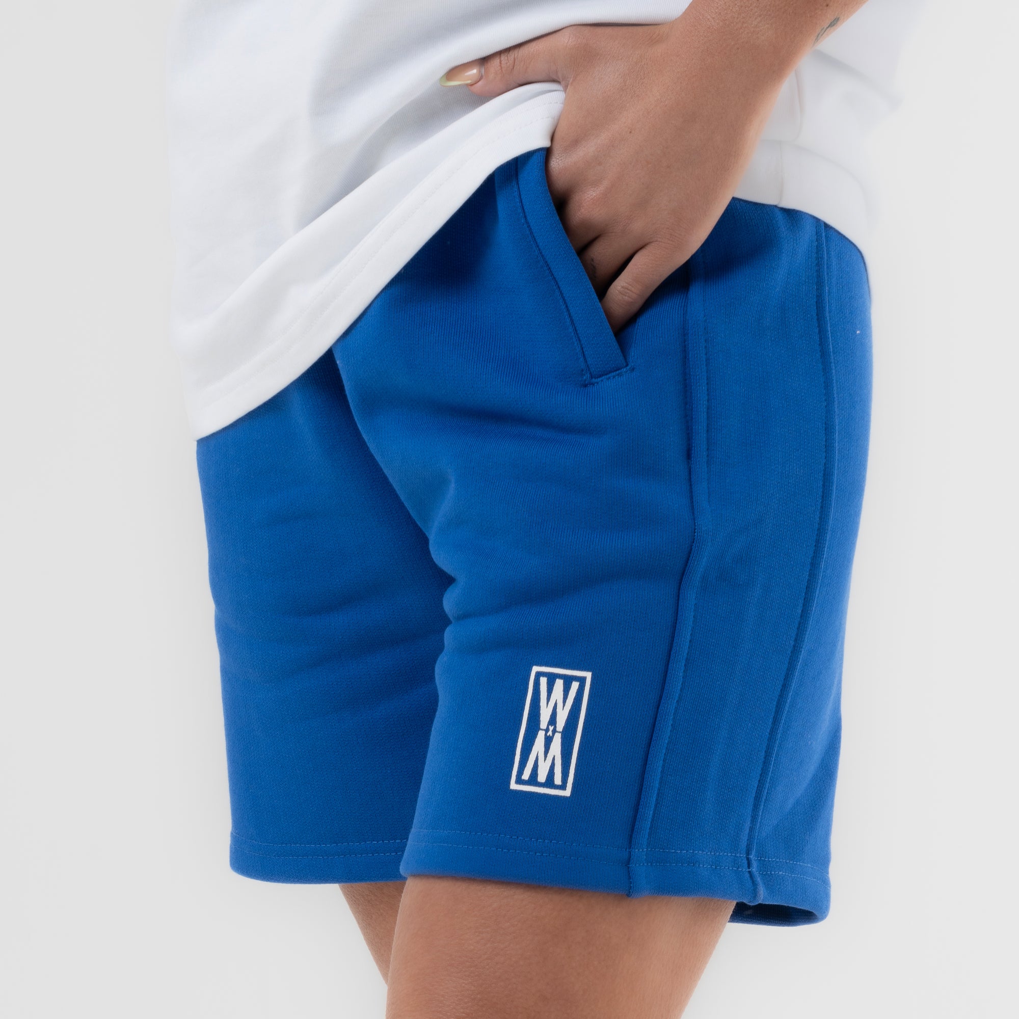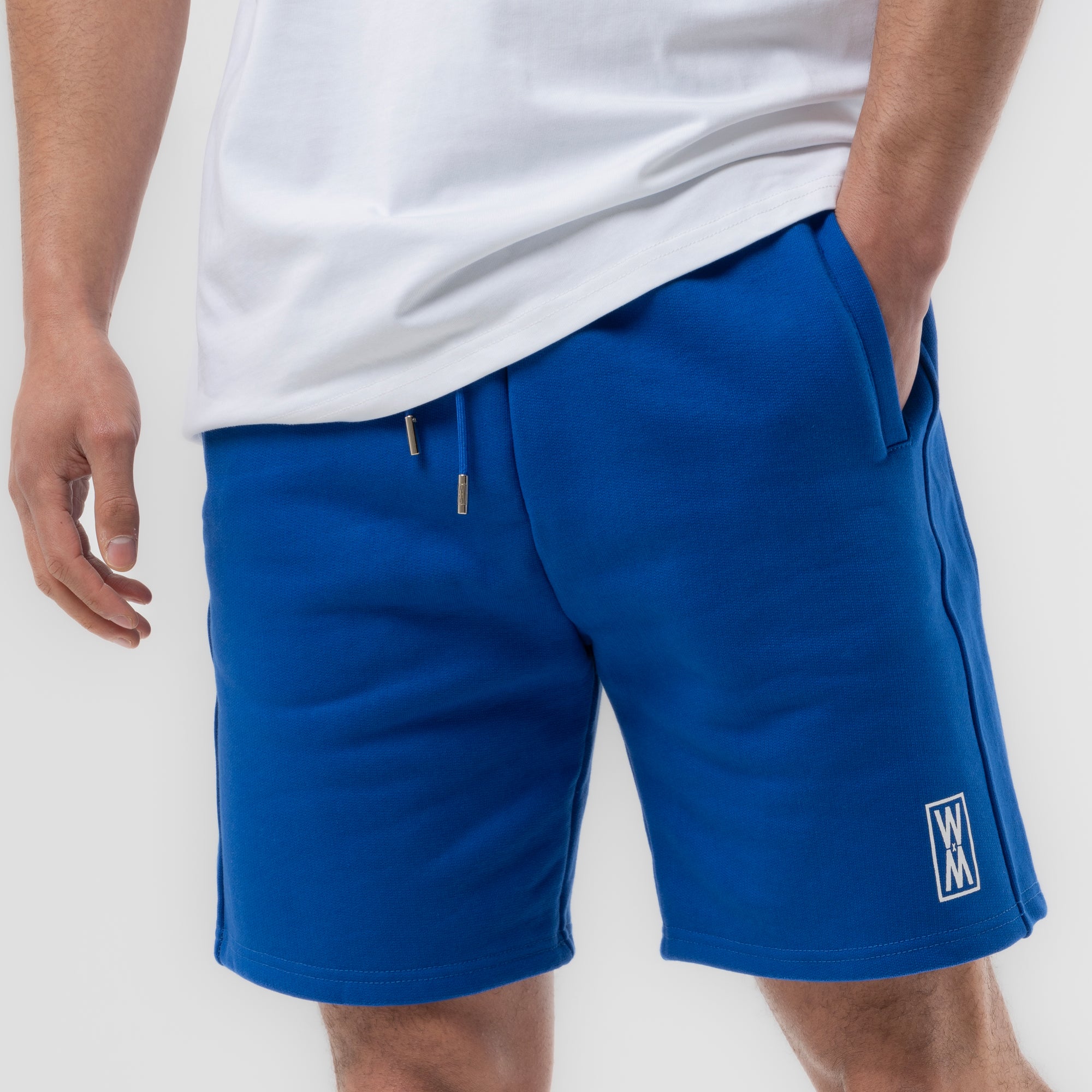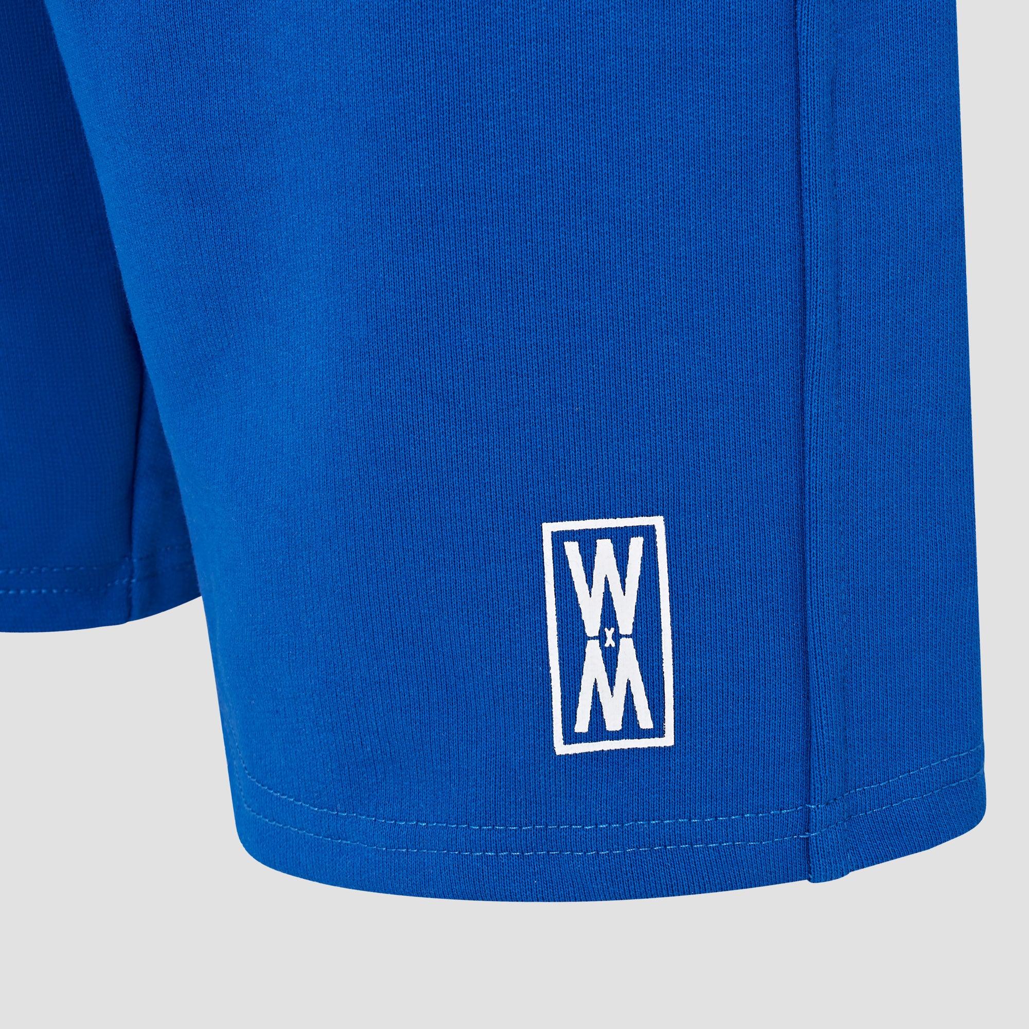 Our Trypan Blue heavyweight 590 gsm cotton loopback shorts with white print, drawstrings and WXM string ends. Finished with with our white WXM brand print to the left leg.