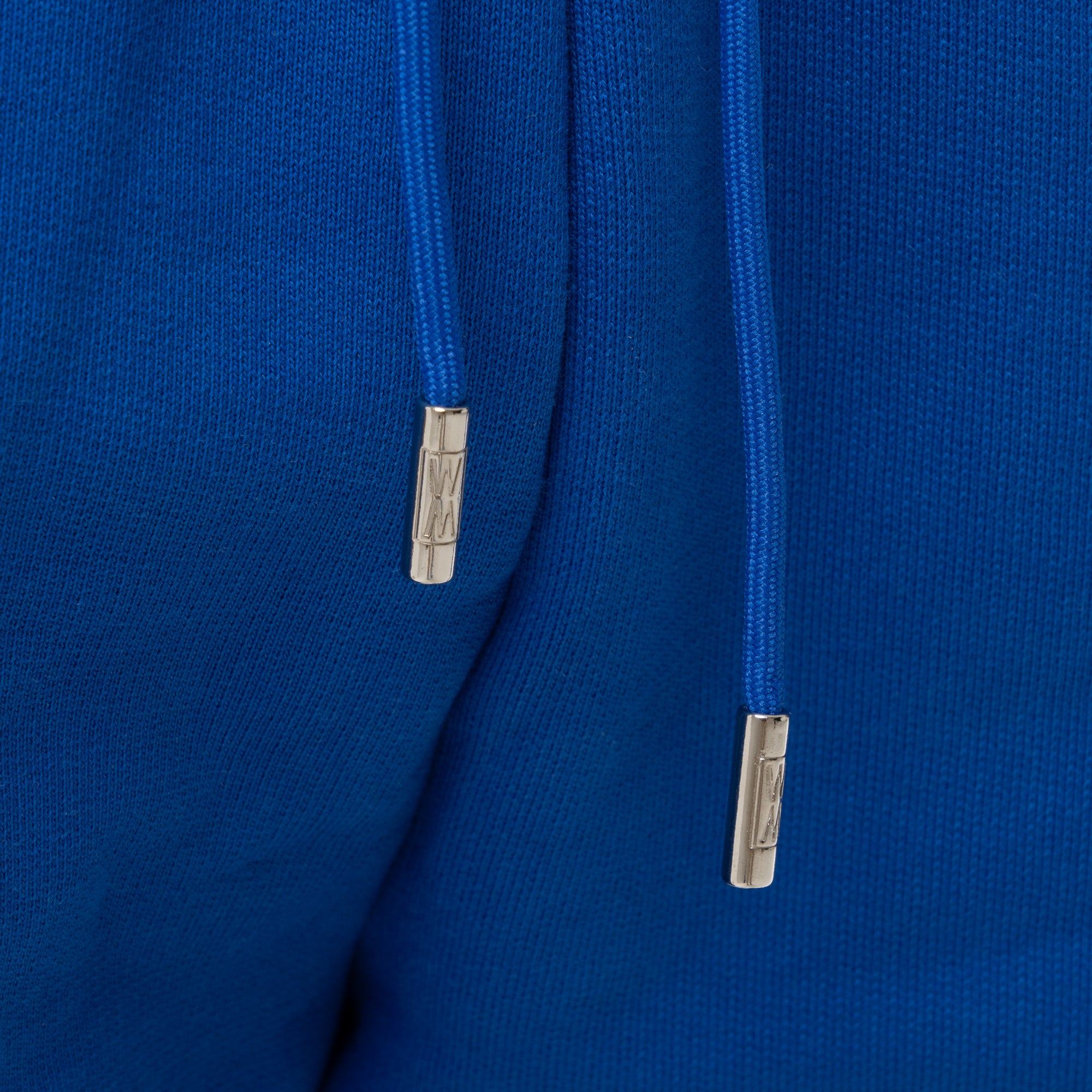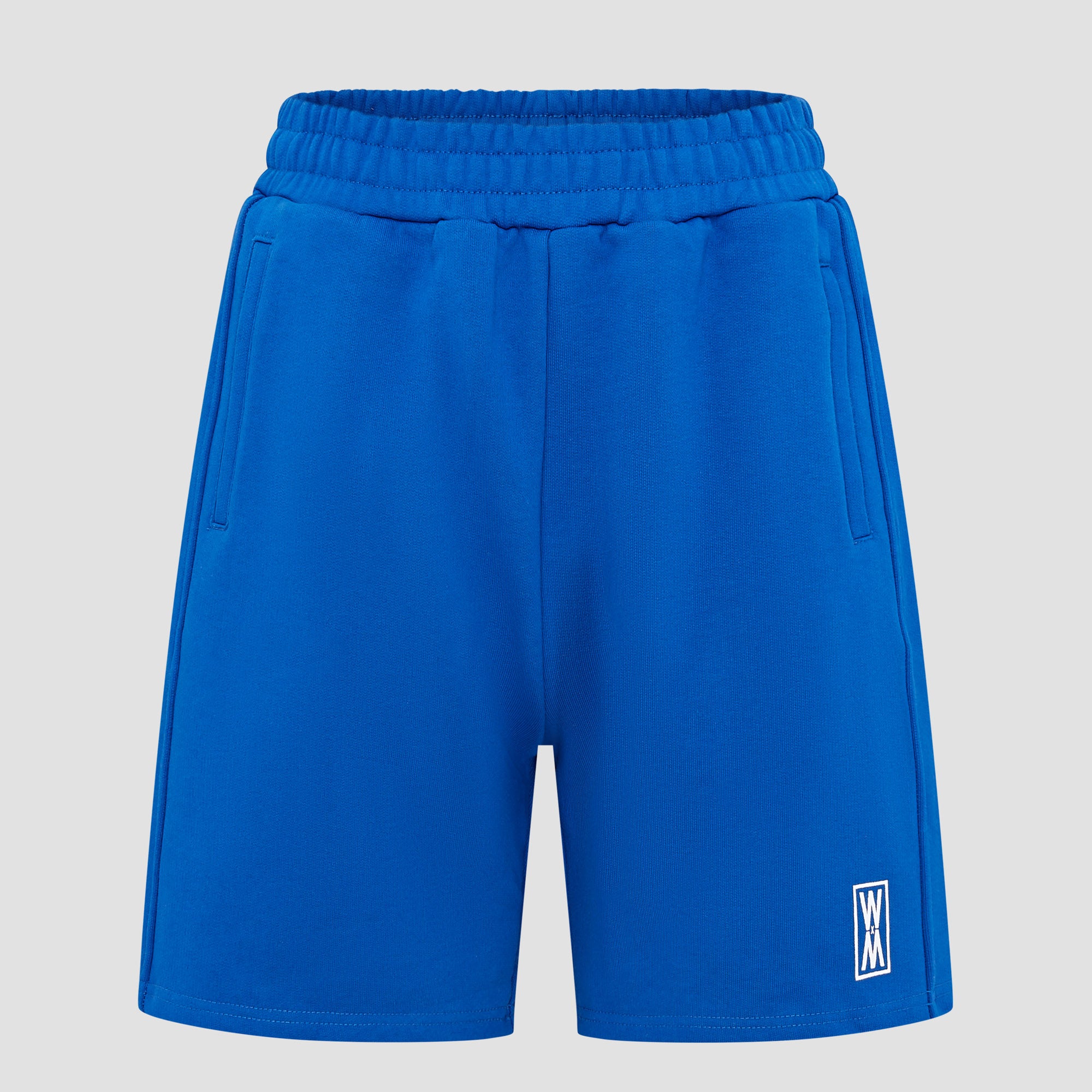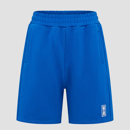 Our Trypan Blue heavyweight 590 gsm cotton loopback shorts with white print, drawstrings and WXM string ends. Finished with with our white WXM brand print to the left leg.